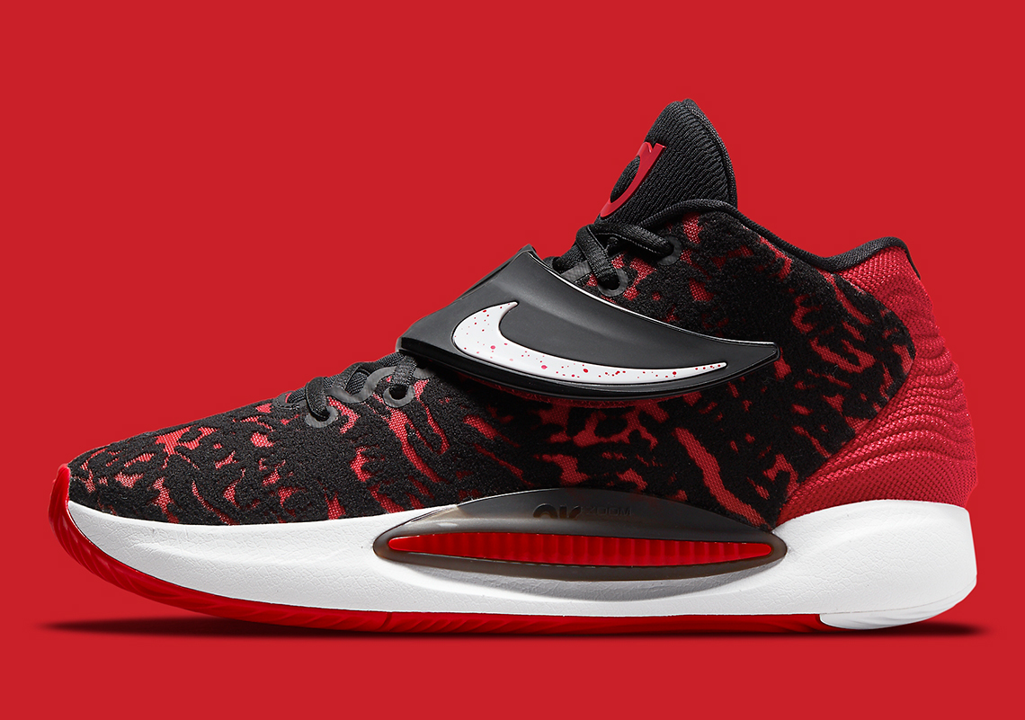 Cũng giống như các phiên bản "Bred" trên bất kì dòng giày nào khác, khi nhắc đến phối màu này gần như ai cũng hình dung được tông màu chủ đạo là 2 màu Đen/Đỏ kết hợp. Điểm khác biệt ở KD 14 có lẽ là ở phần chất liệu Multilayer Mesh với lớp vải dạng hoa văn ở trên mang hoàn toàn gam màu Đen và bao bọc phần vải Mesh sử dụng tông Đỏ ở phía dưới.