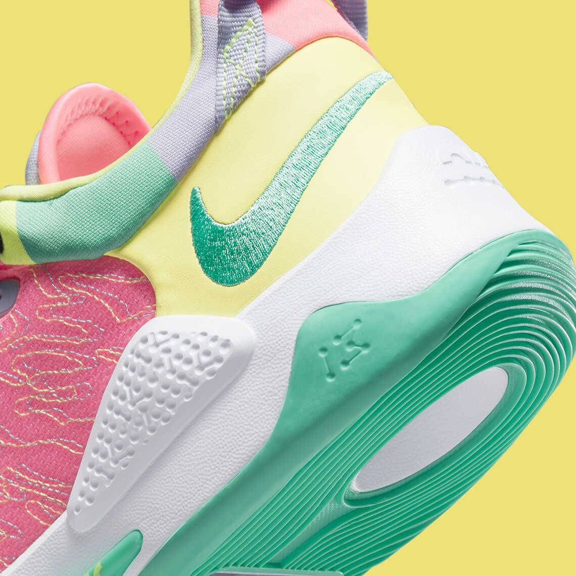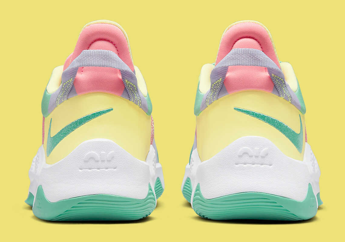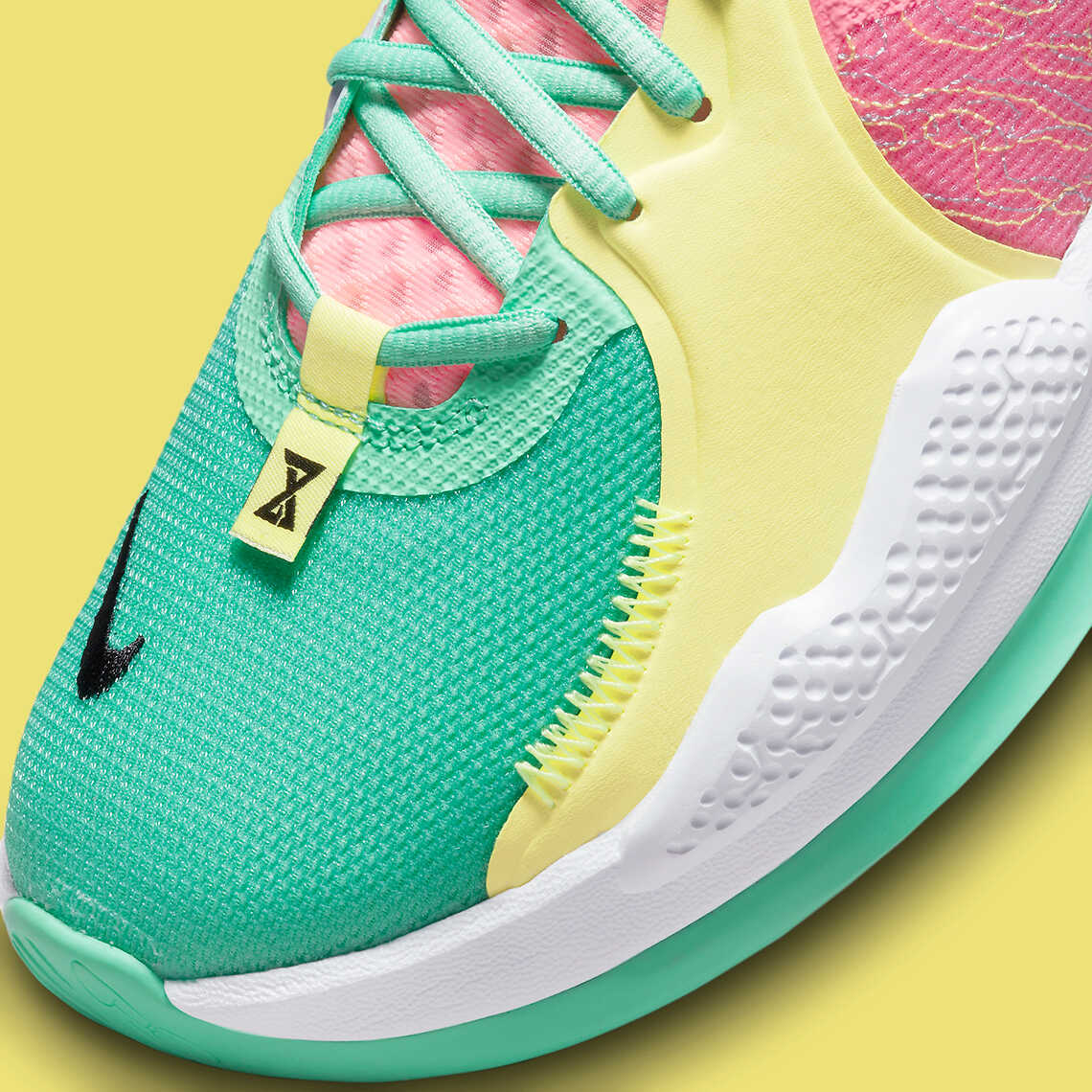 Không giống như phiên bản Kyrie 7 "Daughters" đã trình làng trước đấy khi đặt chi tiết đặc trưng để nhận diện chủ đề ở phía sau gót, phiên bản PG5 này tạo sự nổi bật và gây điểm nhấn thông qua 2 gam màu Xanh Neon/Hồng cánh sen xuyên suốt từ phần đầu Upper nối xuống gót giày, kết hợp sự đan xen giữa 2 gam màu Vàng chanh và Tím nhạt tạo sự tương phản tinh tế giữa các mảng màu sắc liền kề nhau.