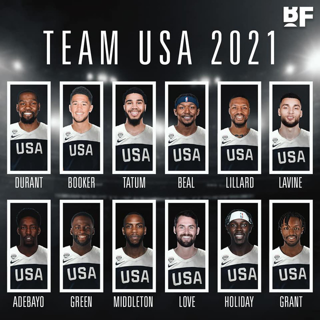 Cách đây không ít lâu, đội tuyển Mỹ - cái nôi của các giải đấu bóng rổ nhà nghề đã chốt danh sách 12 cầu thủ khoác áo đội tuyển tham gia Thế Vận Hội lần này sau khi đã sàng lọc kĩ lưỡng từ danh sách sơ bộ gồm 44 cầu thủ. Đó đều là những cái tên gần như quen thuộc đối với bất kì theo dõi NBA: Kevin Durant, Devin Booker, Jayson Tatum, Bradley Beal, Damian Lillard, Zach Lavine, Bam Adebayo, Draymond Green, Khris Middleton, Kevin Love, Jrue Holiday và Jerami Grant. Huấn luyện viên trưởng dẫn dắt đội tuyển Mỹ lần này sẽ là HLV Gregg Popovich (San Antonio Spurs) cùng 2 vị trí trợ lý HLV là Steve Kerr (Golden State Warriors) và Lloyd Pierce (Atlanta Hawks).