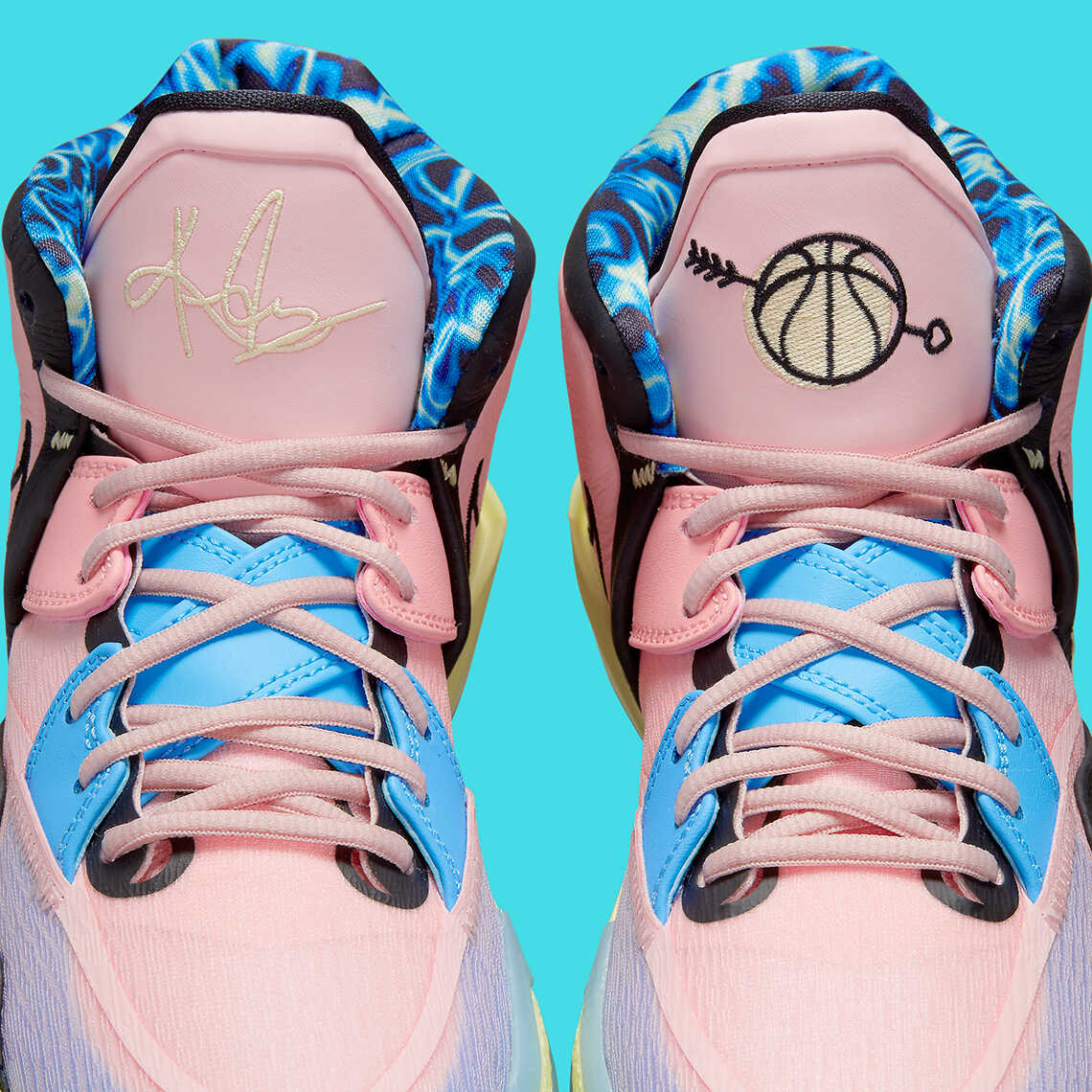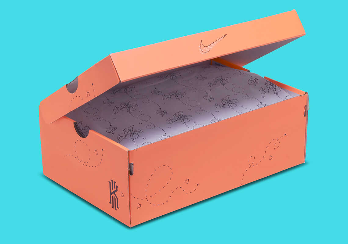 Ở phần lưỡi gà, song song với chữ ký của Kyrie Irving là biểu tượng quả bóng rổ với mũi tên tình yêu xuyên thấu.