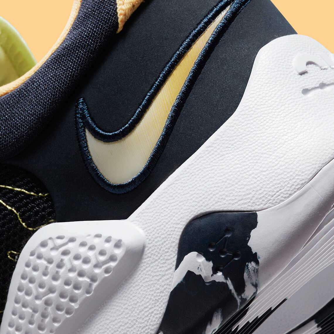 Toàn bộ phần Upper của PG5 "Navy Multi-Color" được trang bị tông màu Xanh Đen cơ bản. Nhưng điểm khác biệt của phối màu này đó là gam màu Neon xanh lục nhẹ nhàng ở phần lưỡi gà và màu Cam Neon tươi rói bên trong gót giày đã khiến đôi giày thoát khỏi sự đơn giản cũng như trở nên bắt mắt hơn rất nhiều.