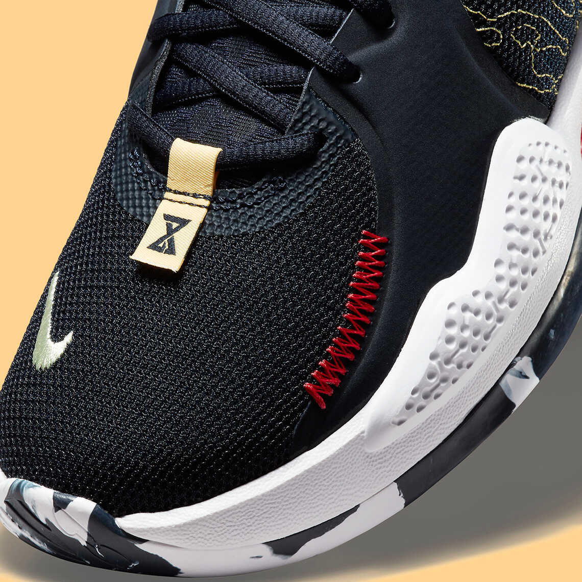 Và cuối cùng là bộ Outsole của PG5 "Navy Multi-Color" là sự hoà quyện hài hoà giữa 2 gam màu Đen/Trắng khiến người xem dễ dàng liên tưởng ngay đến lớp áo nguỵ trang được sử dụng trong quân đội với miếng nhựa nối liền với Midsole màu đỏ như điểm thêm chút nổi bật ở giữa mặt đế.