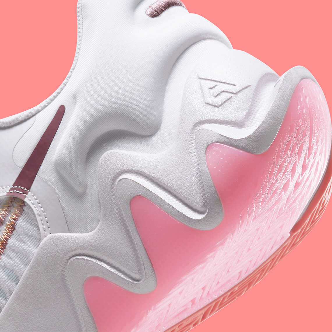 Bộ đế của Giannis Immortality cũng được Nike chăm chút khi phân bổ 2 phối màu Melon Tint cùng Light Mulberry một cách thông minh, chia đôi giày thành 4 mảng màu so le với thiết kế đường bo tròn, khiến tổng thể đôi giày trở nên nhẹ nhàng, mềm mại.